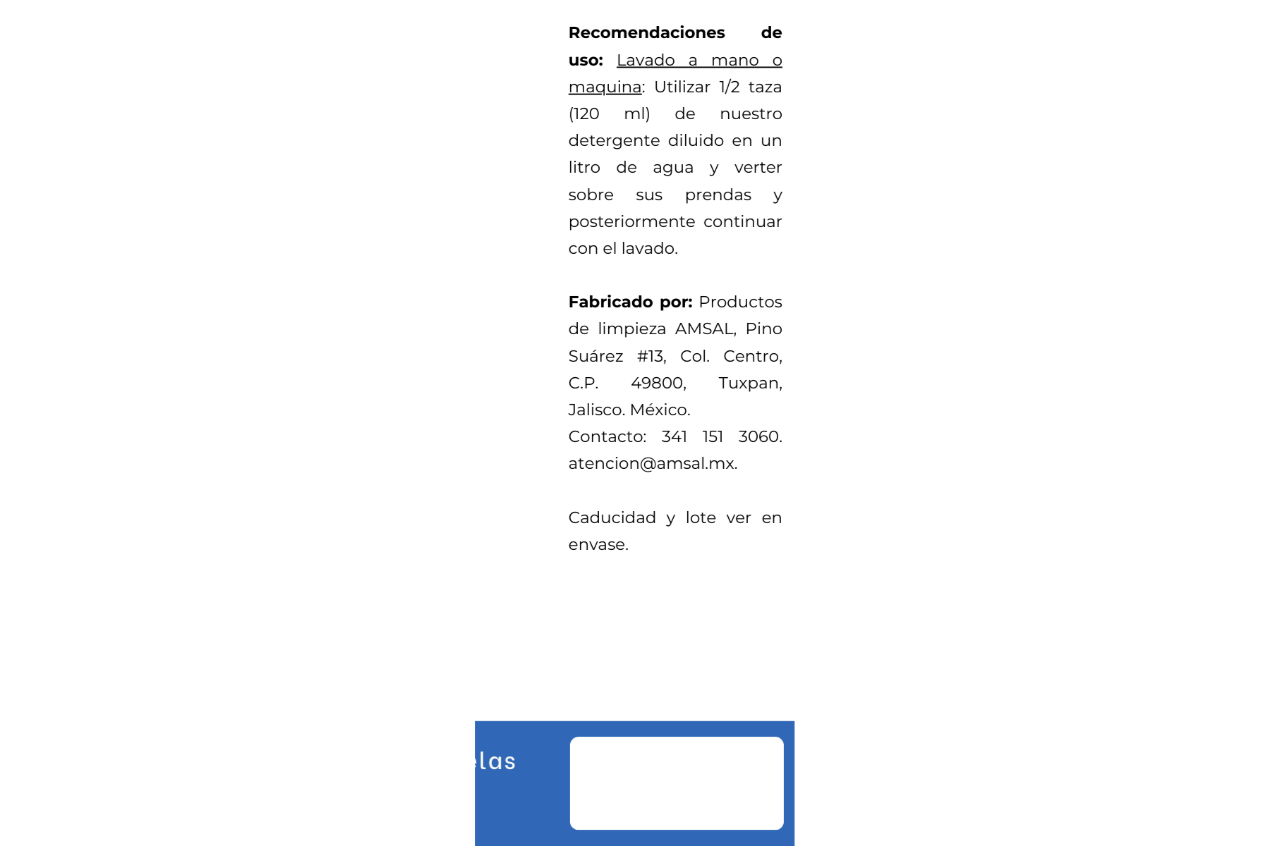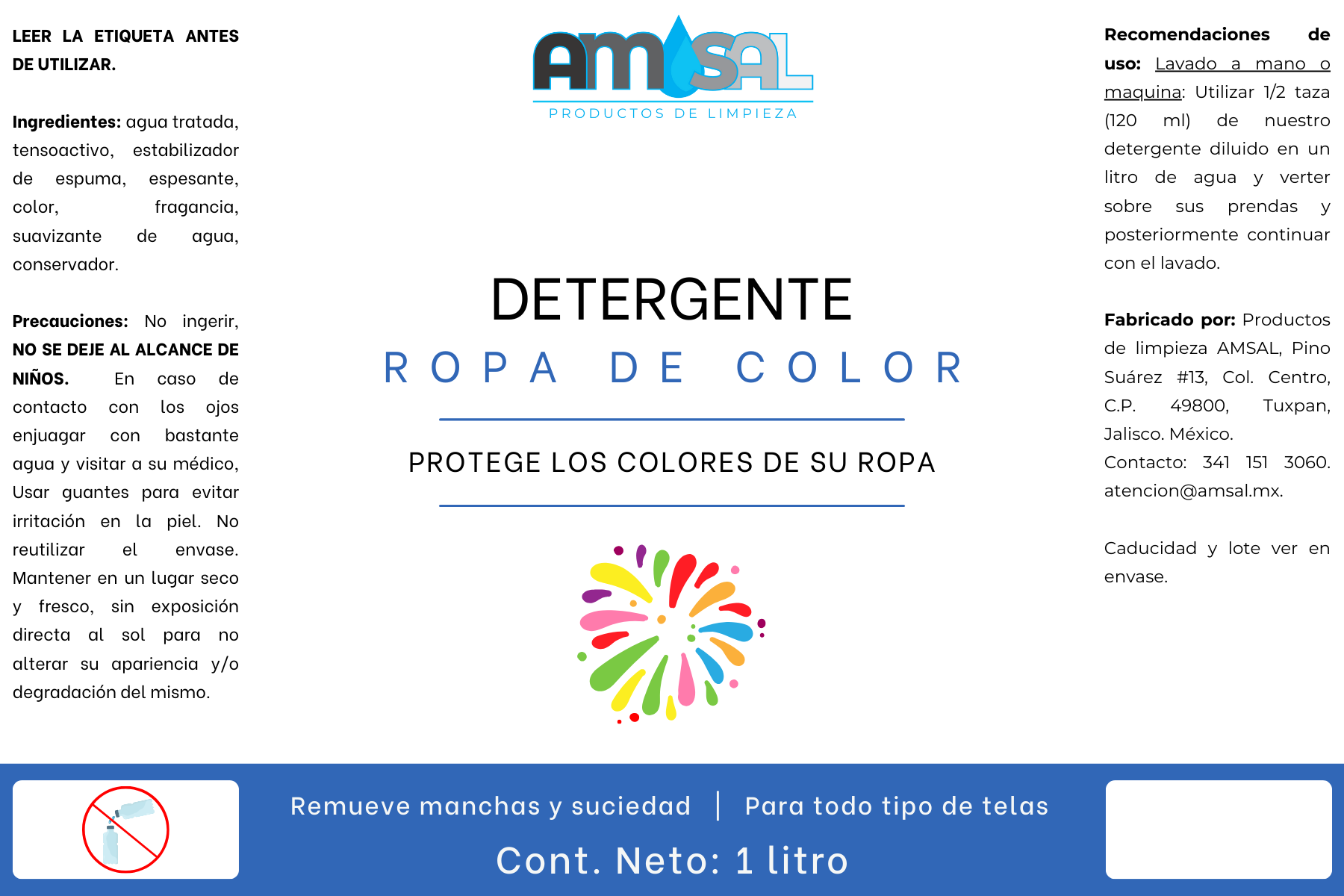 - Diluir 150 ml de cualquiera de nuestros detergentes líquidos AMSAL en 1 litro de agua y verter sobre sus prendas, posteriormente continuar con el lavado.