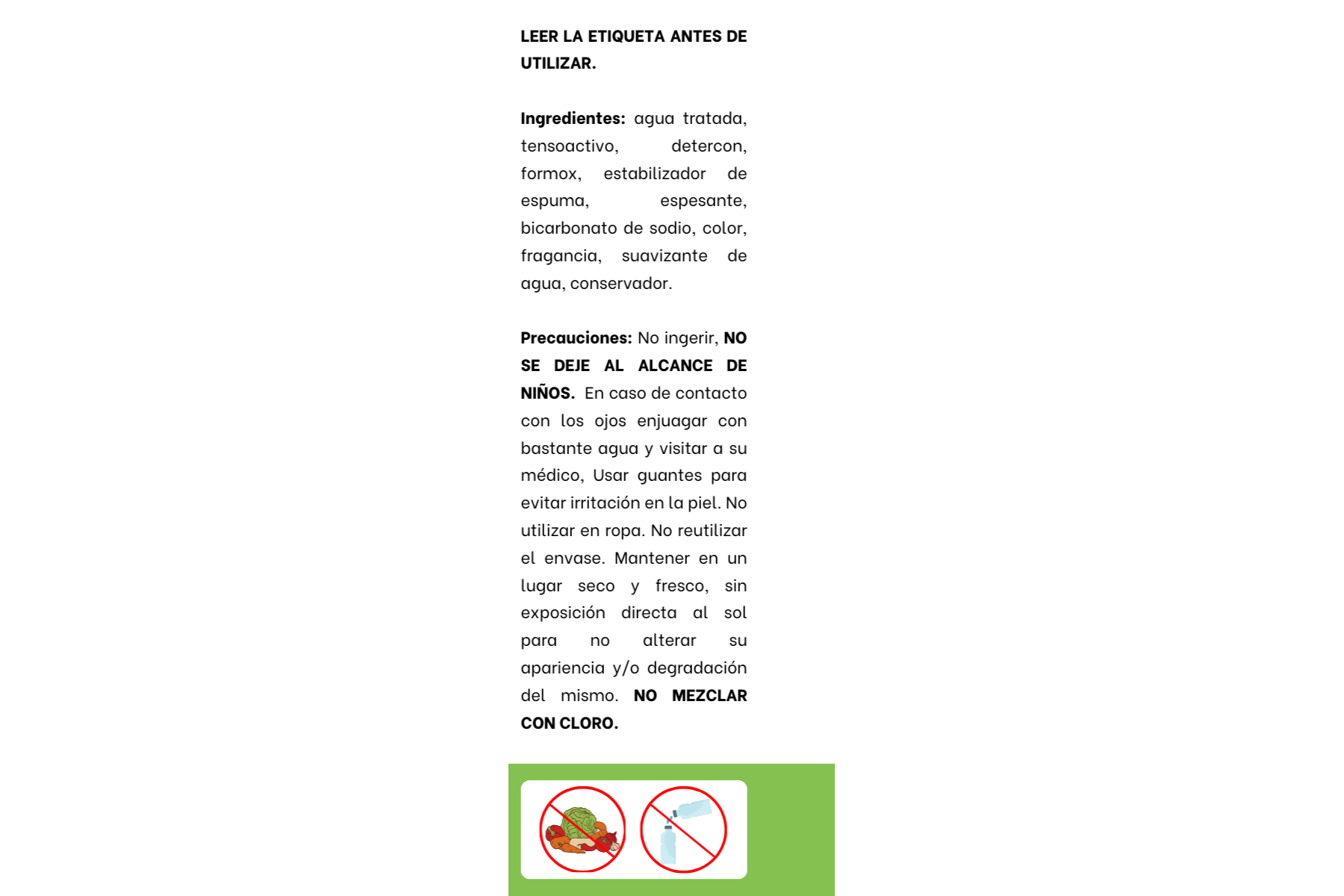 - No mezclar con otros productos de limpieza ya que se pueden producir gases tóxicos, especialmente con cloro.