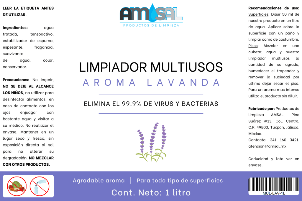 - Puede ser usado directamente o diluido en agua, según la necesidad de limpieza. Para una limpieza general se recomienda diluir 1 parte de limpiador multiusos AMSAL en 10 partes de agua.