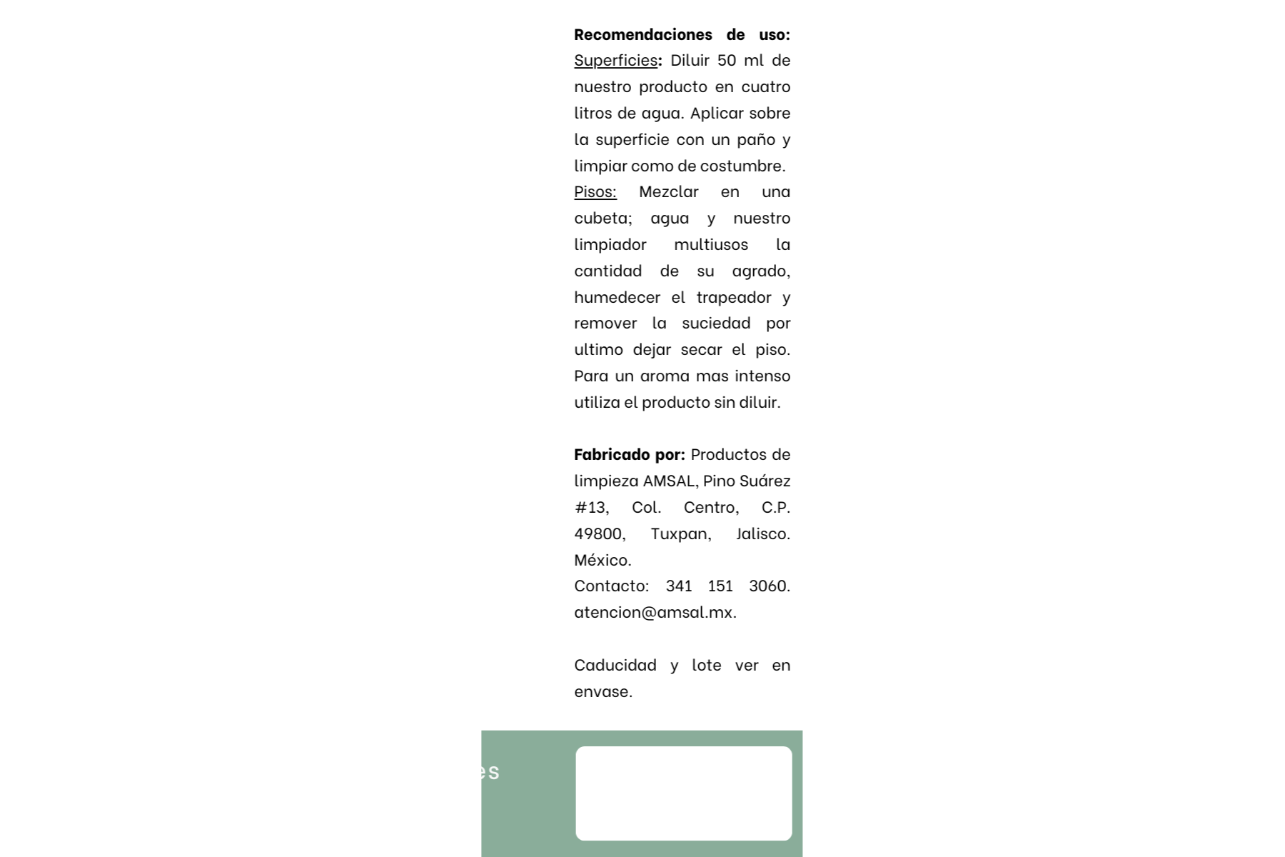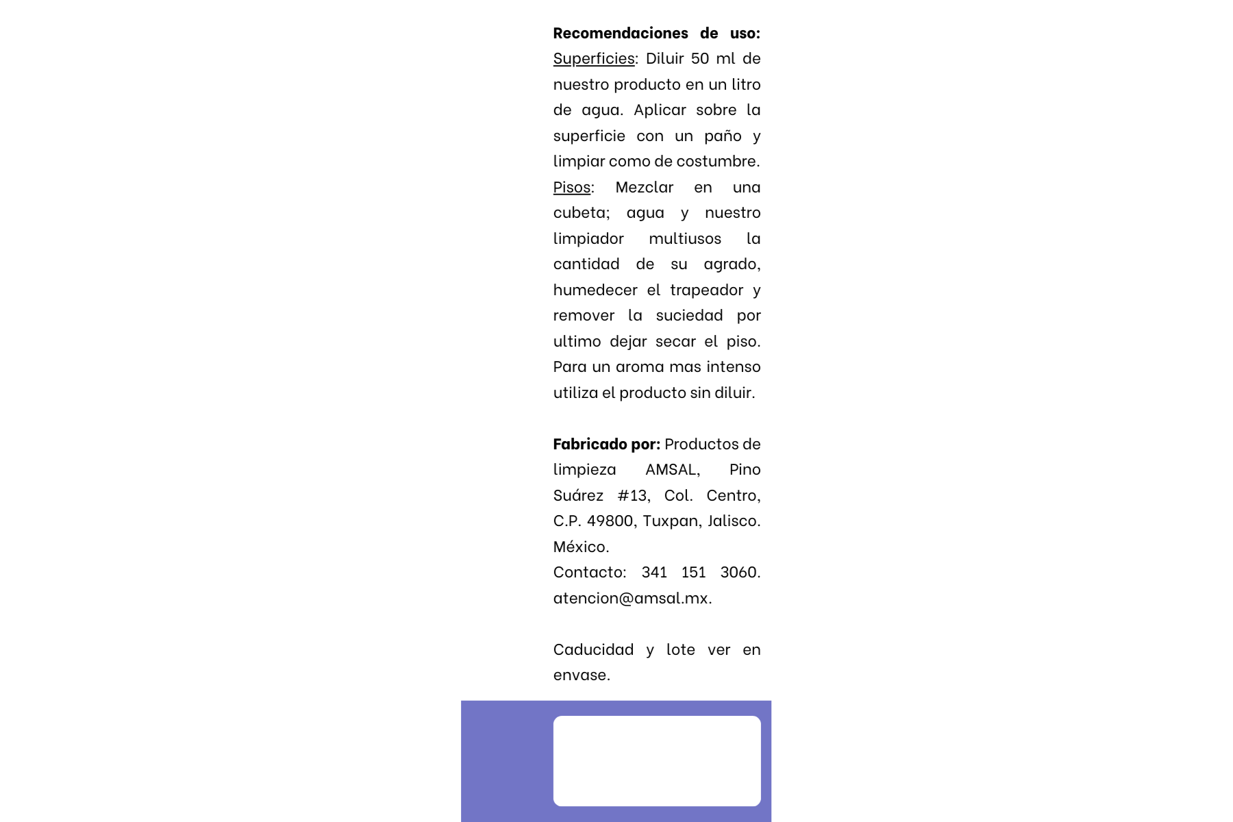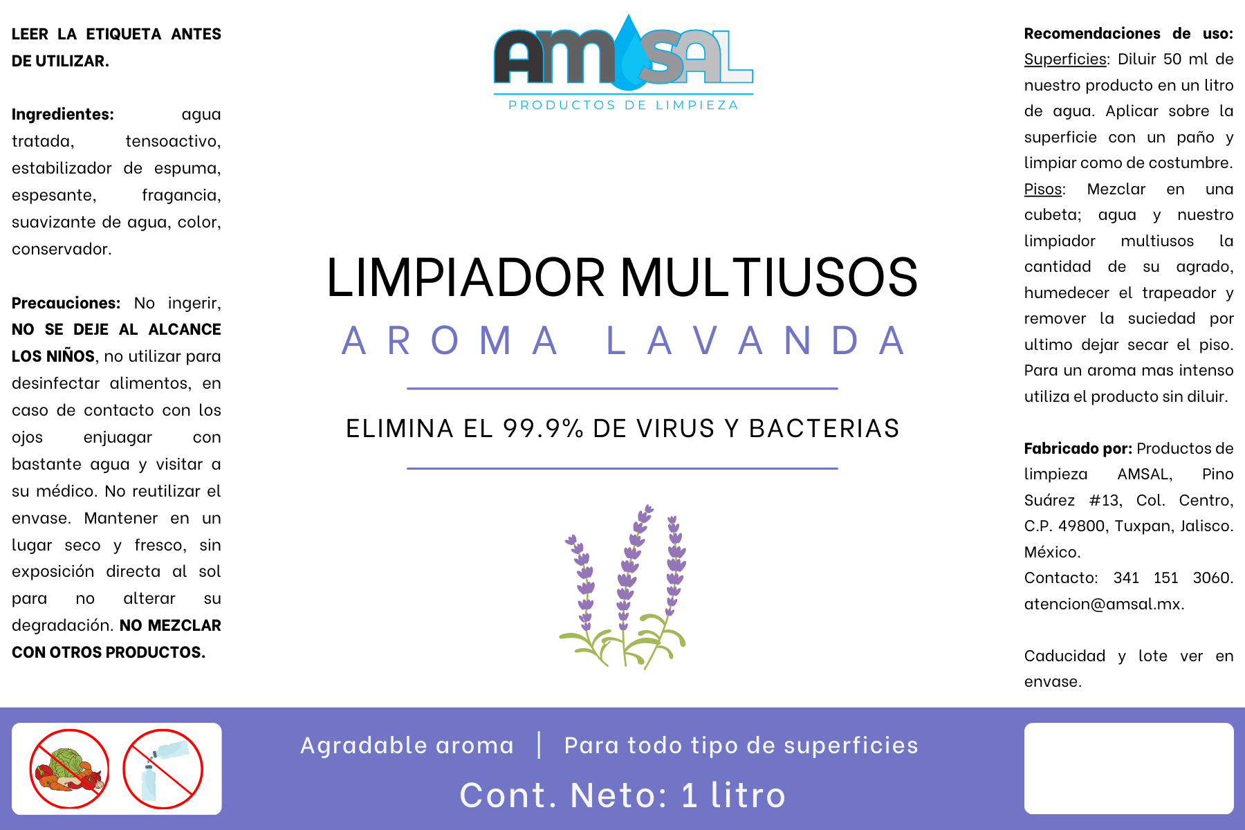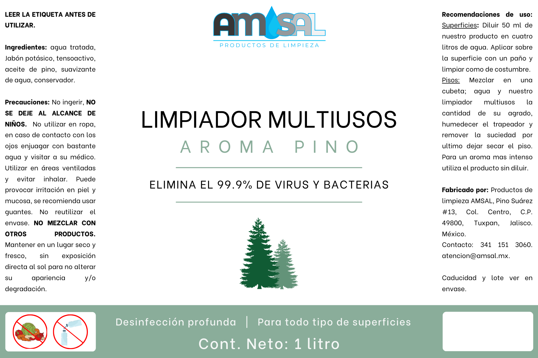 - Puede ser usado directamente o diluido en agua, según la necesidad de limpieza. Para una limpieza general se recomienda diluir 1 parte de limpiador multiusos AMSAL en 10 partes de agua.