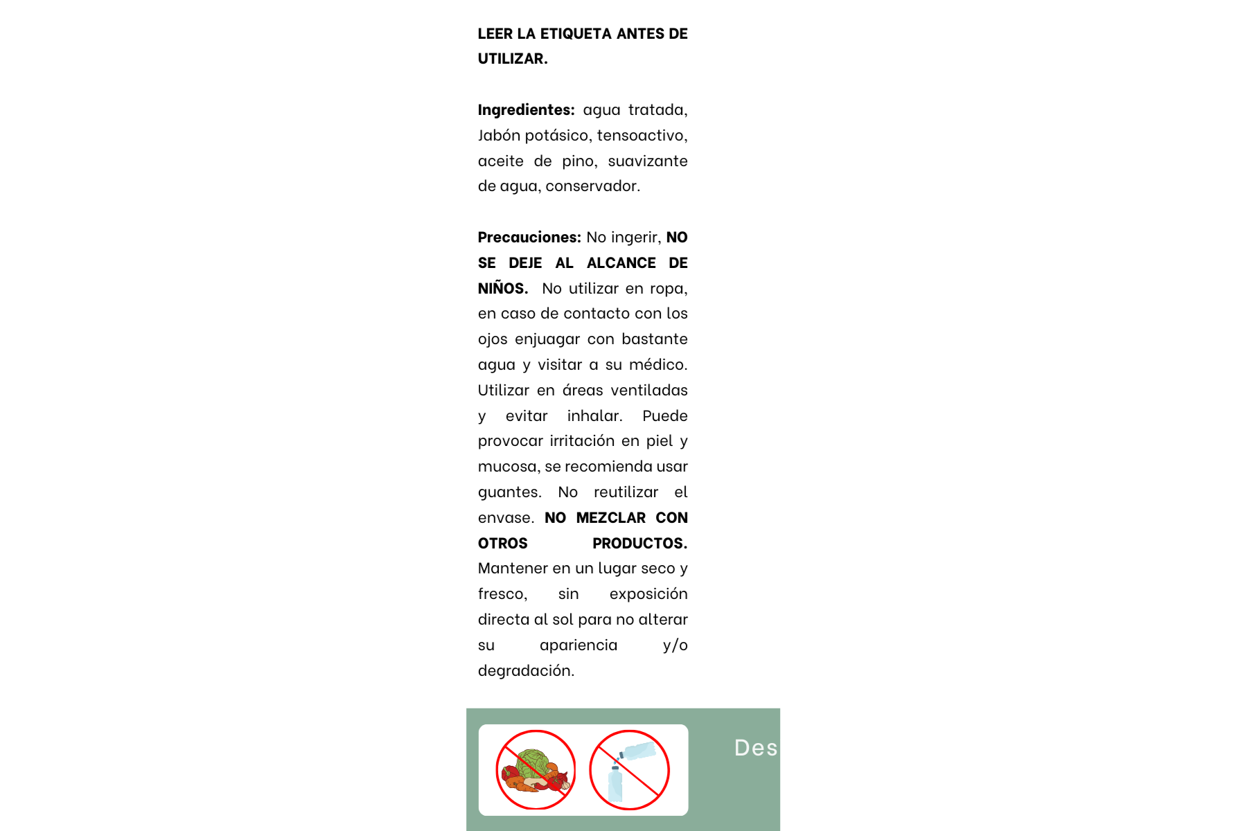 - No mezclar con otros productos de limpieza ya que se pueden producir gases tóxicos.