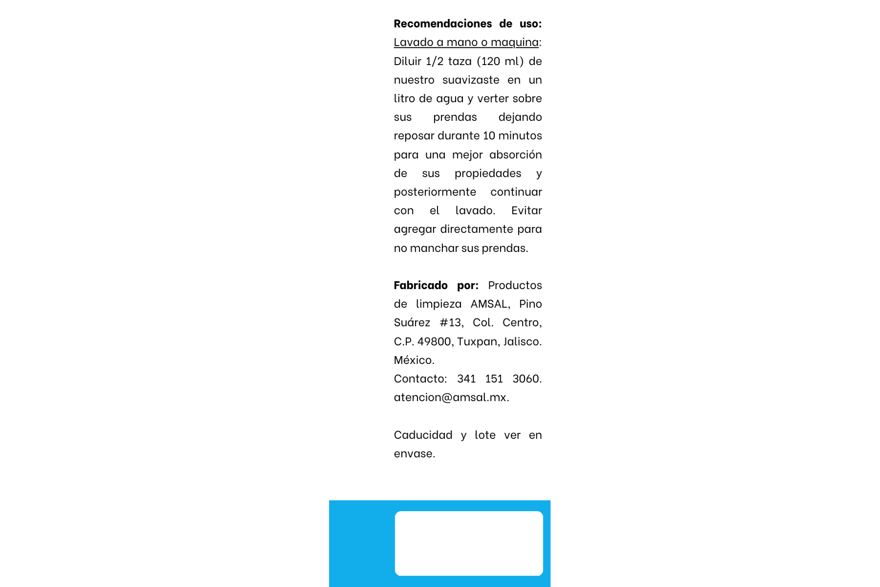 - Diluir 120 ml (media taza) de nuestro suavizaste en un litro de agua y verter sobre sus prendas dejando reposar durante 10 minutos para una mejor absorción de sus propiedades, posteriormente continuar con el lavado.